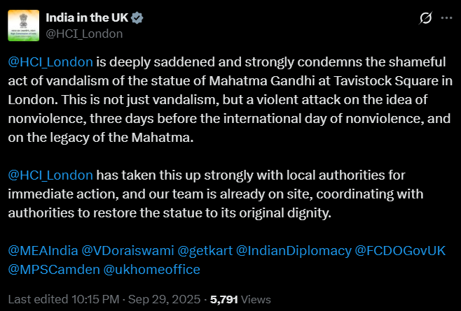 The Indian High Commission in London strongly condemned the act, calling it “shameful” and a “violent attack on the idea of nonviolence.” Officials also coordinated with local authorities to ensure that the statue is cleaned and restored before Gandhi Jayanti.